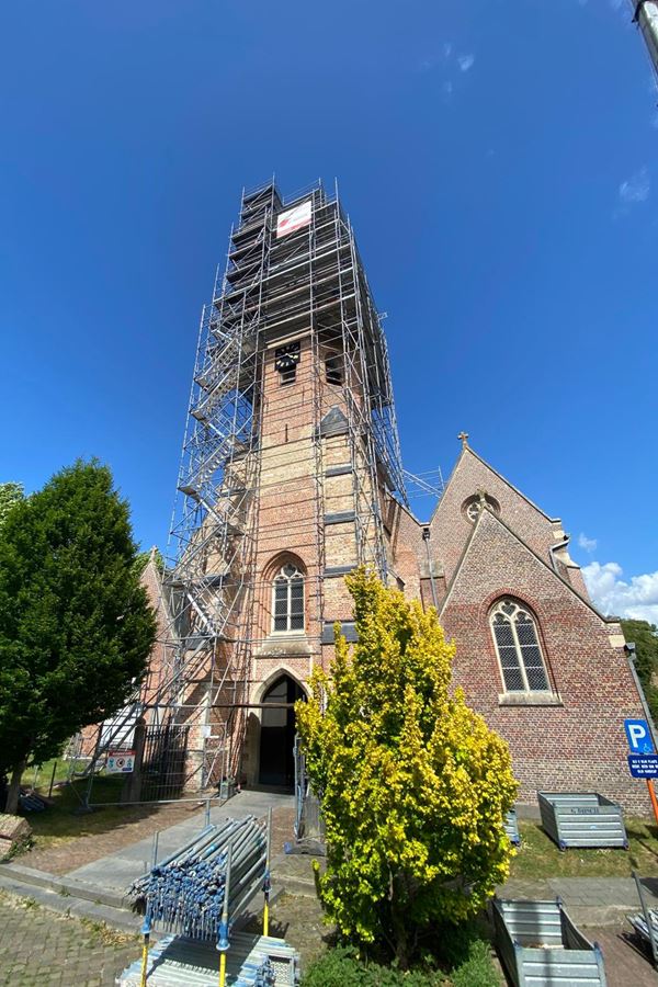 De werf is nu klaar voor de restauratiefase: het nauwgezet plaatsen van nieuwe natuurleien op de torenspits, met respect voor de oorspronkelijke vormgeving en het karakter van het gebouw.